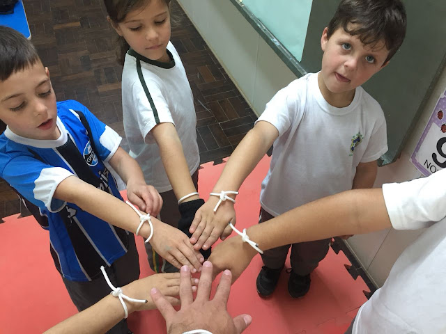 E nas aulas de Educação Física, o Professor Rodrigo realizou algumas práticas de locomoção com a cadeira de rodas para os alunos vivenciarem como que é locomover-se em uma cadeira de rodas, realizaram também atividades com os olhos vendados (passar no tapete dos sentidos, adivinhar o amigo pelo toque e etc), explorando todos os outros sentidos e os alunos perceberam a dificuldade de não poder enxergar. O professor passou também um filme (Cuerdas) que retratava a história de um menino com Paralisia Cerebral (PC).